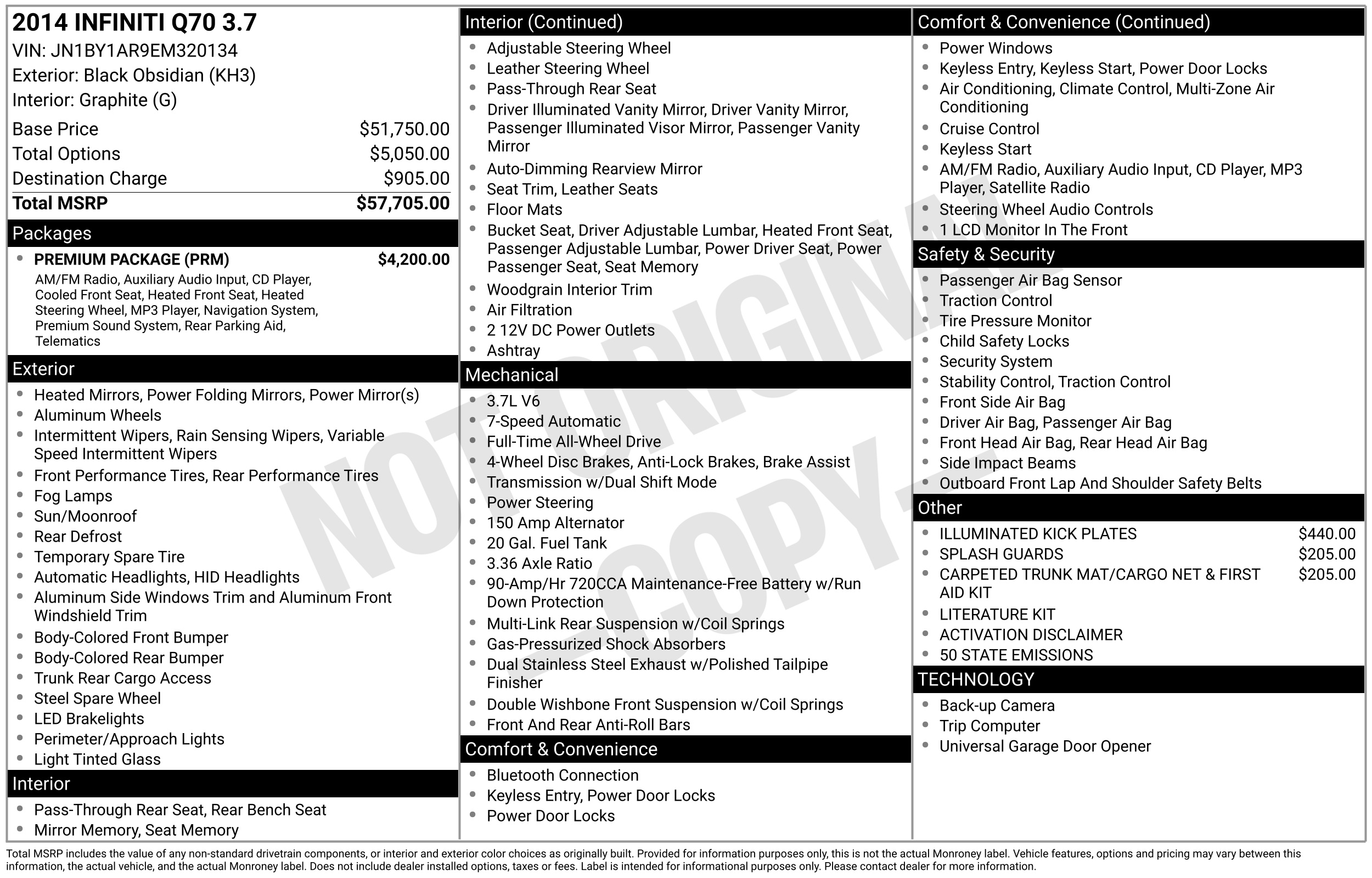 [U01] PREMIUM PACKAGE -inc: Bose 2-Channel 10 -Speaker Premium Audio System Climate-Controlled Front Seats Rear Sonar System INFINITI Connection Telematics System Available safety security and convenience service Heated Steering Wheel Radio: INFINITI Hard Drive Navigation System 8" VGA color touch-screen NavTraffic w/Real-Time traffic information and Zagat survey restaurant guide