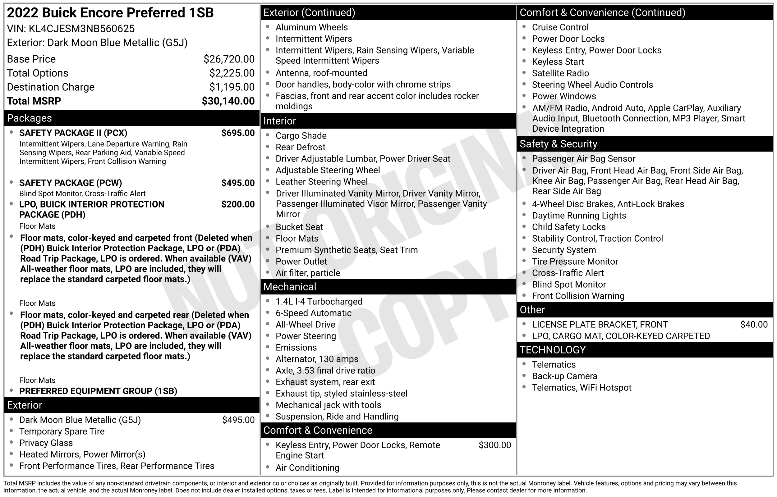 Delivering a sophisticated boutique SUV experience in a package that is perfectly sized for city living, this 2022 Buick Encore Preferred (Stock #NB560625) arrives with 65,647 miles and the more powerful 1.4L Turbo engine that was standard for its final model year. This upgraded powertrain provides a crisp 155 horsepower, making it feel much more energetic during highway merges than older versions while still keeping fuel costs low. The true standout feature is Buicks QuietTuning technology, which utilizes active noise cancellation and acoustic-laminated glass to create a cabin environment that is significantly more hushed and premium than typical subcompact crossovers. Inside, youll find an 8-inch touchscreen with standard Apple CarPlay and Android Auto , plus a highly versatile cargo area featuring a fold-flat front passenger seat that allows you to transport long items with ease. With its elevated ride height, tight turning radius, and a focus on serene comfort, this Encore is the ideal choice for the driver who wants a luxury feel without the luxury price tag.Previously rental vehicle . Visit Car2Sell online at car2sell.us to see more pictures of this vehicle or call us at 888-703-0003 today to schedule your test drive.We Finance Good and Bad credit. Warranty available. Prices include(s) all costs to be paid by a consumer except for licensing costs registration fees taxes and delivery charges.