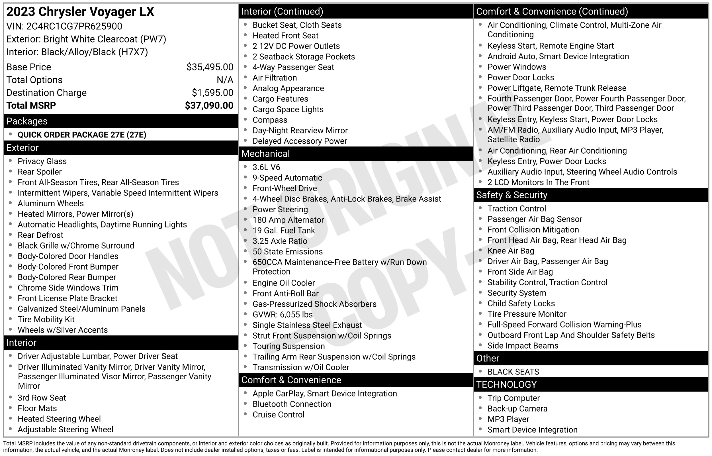 Designed with a focus on family-first utility and modern connectivity, this 2023 Chrysler Voyager LX (Stock #PR625900) arrives with 55,309 miles and the refined architecture of the award-winning Pacifica platform. Under the hood, the robust 3.6L Pentastar V6 engine delivers a confident 287 horsepower, paired with a smooth 9-speed automatic transmission that ensures a quiet, composed ride for up to seven passengers. The LX trim is tailored for effortless logistics, featuring power-sliding side doors, a power liftgate, and the industry-leading Stow 'n Go seating system, which allows the rear rows to disappear into the floor for a massive 140.5-cubic-foot cargo area. Inside, the cabin is anchored by a 7-inch Uconnect 5 touchscreen featuring wireless Apple CarPlay and Android Auto , while standard heated front seats and a heated steering wheel provide a premium touch for all-weather comfort. With a 5-star overall safety rating and standard driver-assist tech like Automatic Emergency Braking, this Voyager offers a high-value, tech-forward shuttle experience that prioritizes both security and versatility.Previously rental vehicle . Visit Car2Sell online at car2sell.us to see more pictures of this vehicle or call us at 888-703-0003 today to schedule your test drive.We Finance Good and Bad credit. Warranty available. Prices include(s) all costs to be paid by a consumer except for licensing costs registration fees taxes and delivery charges.